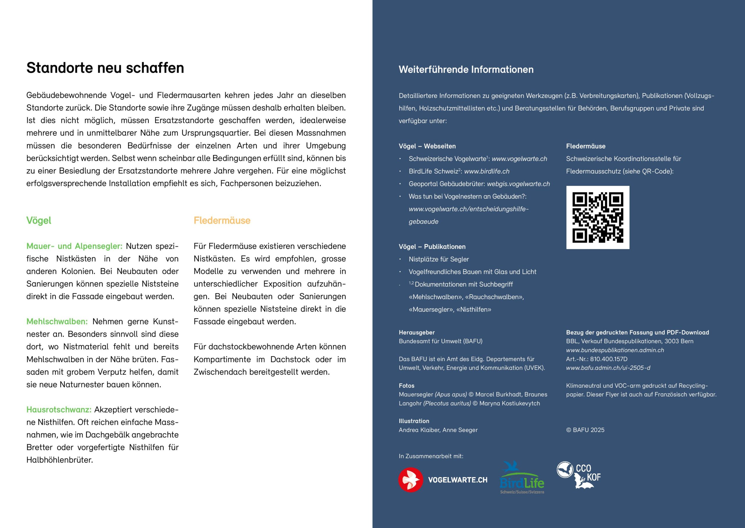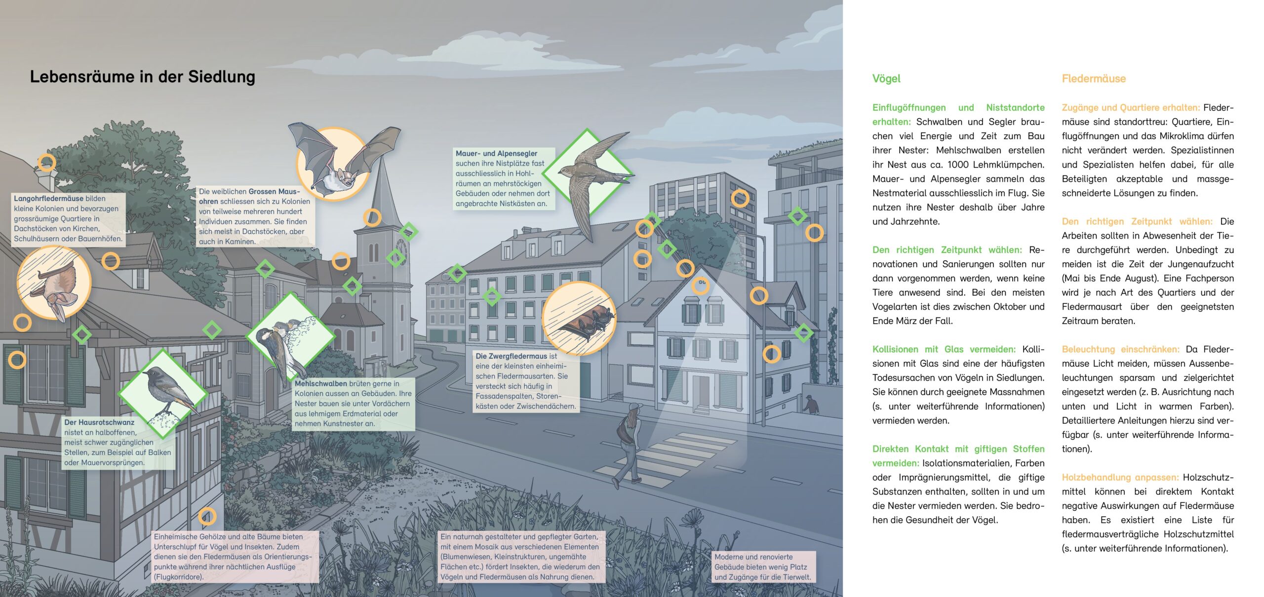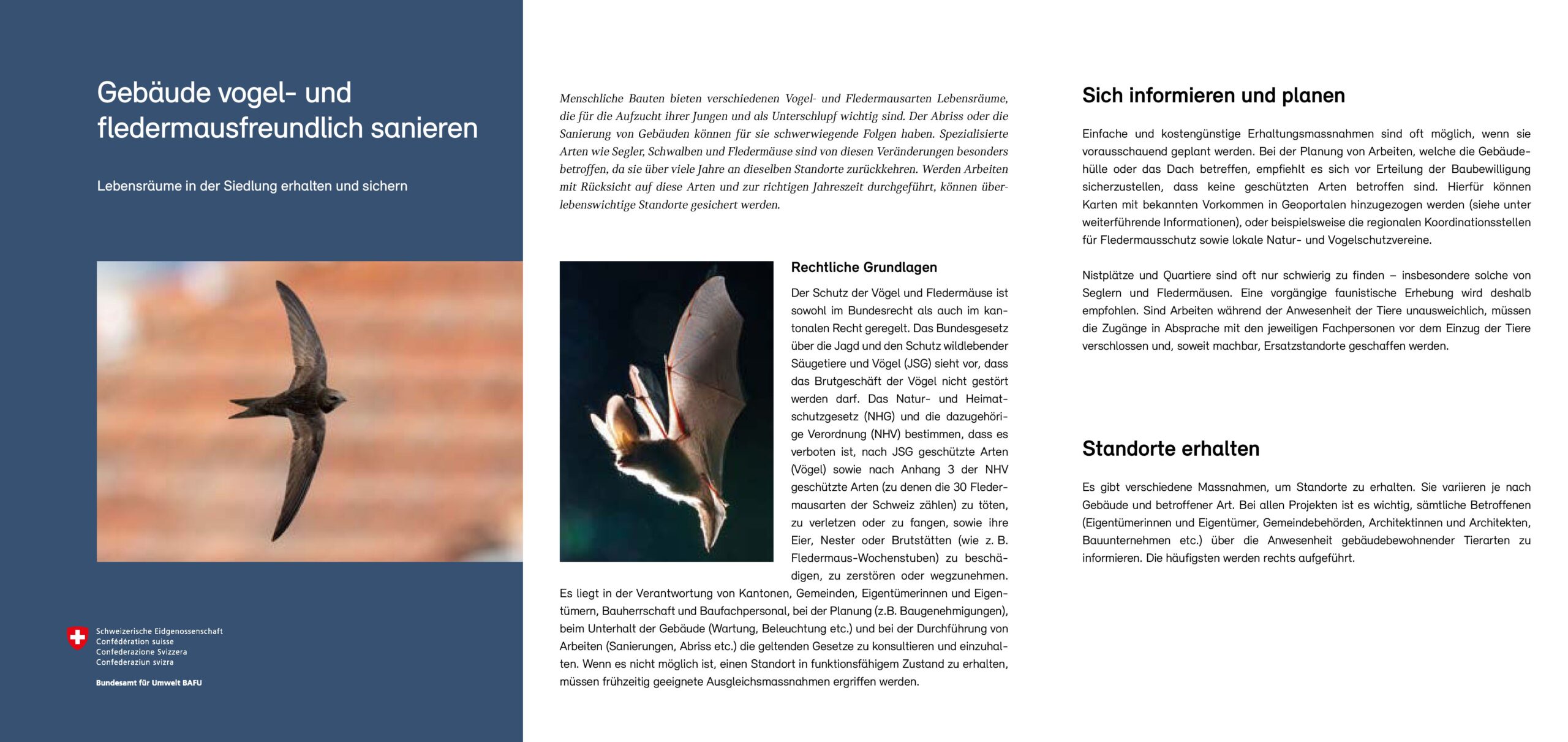 Menschliche Bauten bieten verschiedenen Vogel- und Fledermausarten Lebensräume, die für die Aufzucht ihrer Jungen und als Unterschlupf wichtig sind. Der Abriss oder die Sanierung von Gebäuden können für sie schwerwiegende Folgen haben. Das Merkblatt zeigt auf, wie Sanierungsarbeiten mit Rücksicht auf diese Arten durchgeführt werden können.