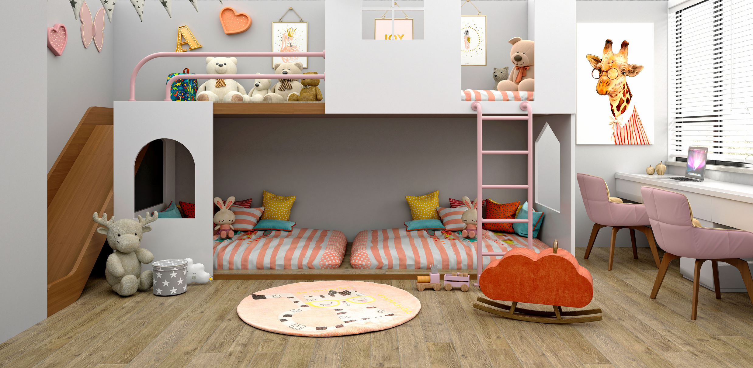 Schlaf hoch, spiel tief. Der Raum unter dem Hochbett ist als Spielfläche nutzbar. Mit ein wenig handwerklichem Geschick können an der Decke festgeschraubte Brücken zwischen den Betten oder auf massiven Schränken und Kommoden fixierte Spielplattformen (mit Geländer) kreiert und so weitere Spielebenen geschaffen werden.
