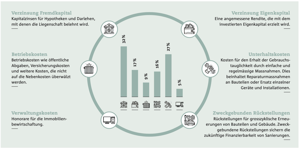 Die Berechnung einer kostendeckenden Miete ist komplex und hier vereinfacht dargestellt. Bei jeder Mietzinsberechnung müssen die verschiedenen Faktoren auf das jeweilige Mietobjekt abgestimmt sein. Die Berechnung von neuen Mietzinsen basiert auf anderen Berechnungsfaktoren als die Überprüfung von bestehenden Mietverhältnissen.
