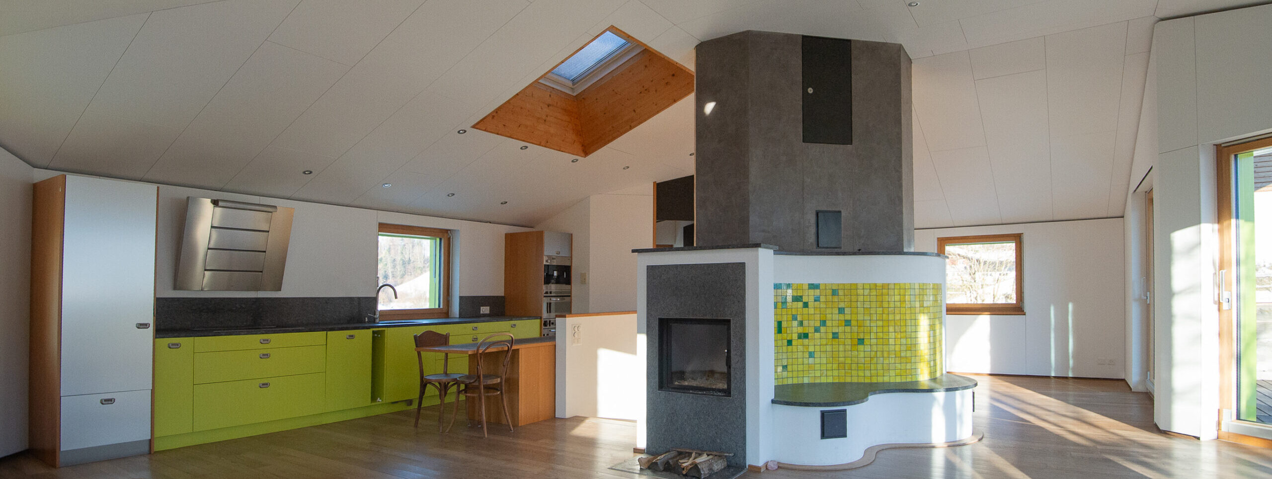 Die Heizkosten für das Haus betrugen im Durchschnitt der letzten Jahre 1550 Franken, darin eingerechnet 1,5 Ster Brennholz für den Schwedenofen. Der Jahres-Heizwärmebedarf der 411 Quadratmeter grossen Energiebezugsfläche liegt bei knapp 16 500 kWh, was etwa 40 kWh pro Quadratmeter entspricht. «Dieser Wert war bereits 2003 besser als Minergie- P und entspricht praktisch dem heutigen Standard von Minergie », erklärt die Architektin. Eine PV-Solaranlage wurde seinerzeit aus Kostengründen und aufgrund der Dachform aufgeschoben, kann aber jederzeit nachgebaut werden. Aktuell besteht eine Option für Balkonpaneele.
